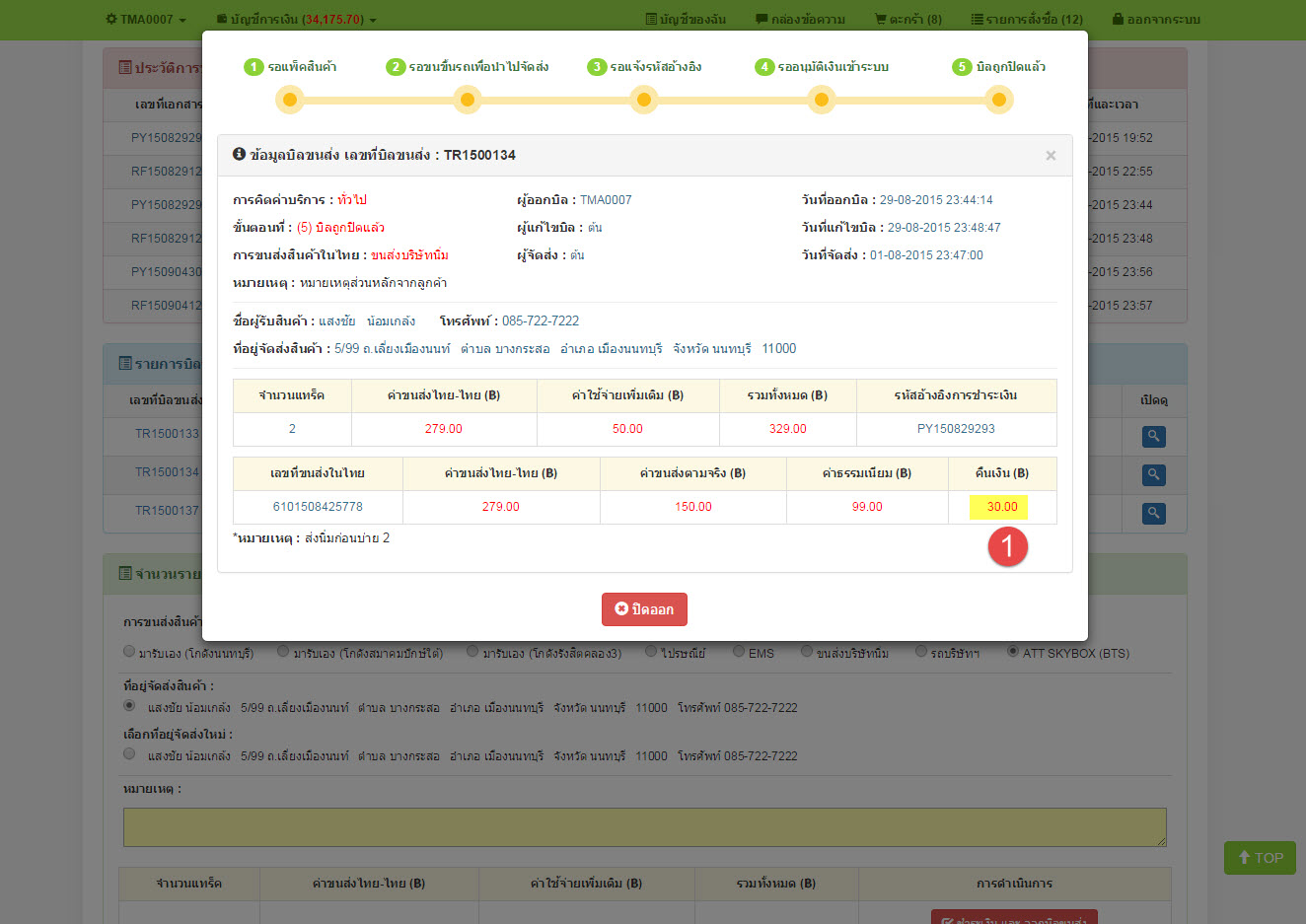 หลังจากบิลขนส่งนั้นๆอยู่ที่ขั้นตอนที่ 5 (สถานะปิดบิลแล้ว) และคุณลูกค้าสามารถตรวจสอบยอดเงินที่ได้รับคืนได้