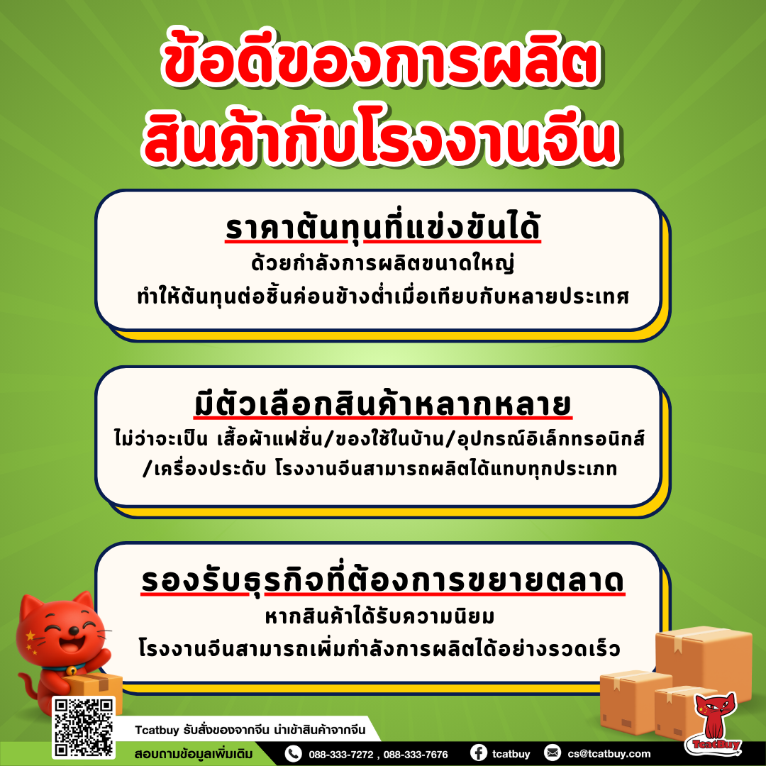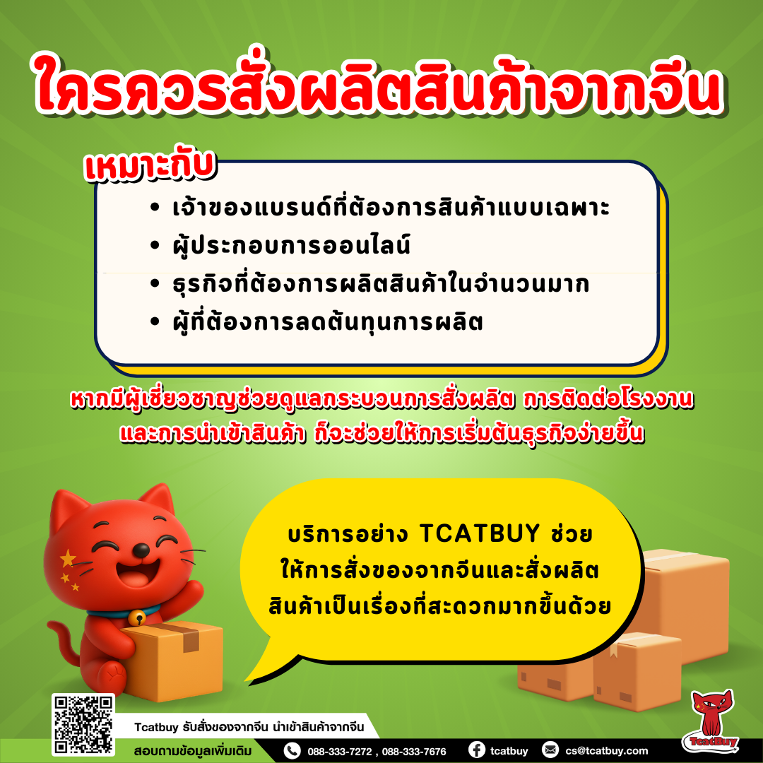 หากมีผู้เชี่ยวชาญช่วยดูแลกระบวนการสั่งผลิต การติดต่อโรงงาน และการนำเข้าสินค้า ก็จะช่วยให้การเริ่มต้นธุรกิจง่ายขึ้นบริการอย่าง Tcatbuy จึงช่วยให้การสั่งของจากจีนและสั่งผลิตสินค้าเป็นเรื่องที่สะดวกมากขึ้นเพียงส่งลิงก์ของที่ต้องการให้กับ Tcatbuy หรือเข้าไปสั่งของเองได้ที่ www.tcatbuy.com