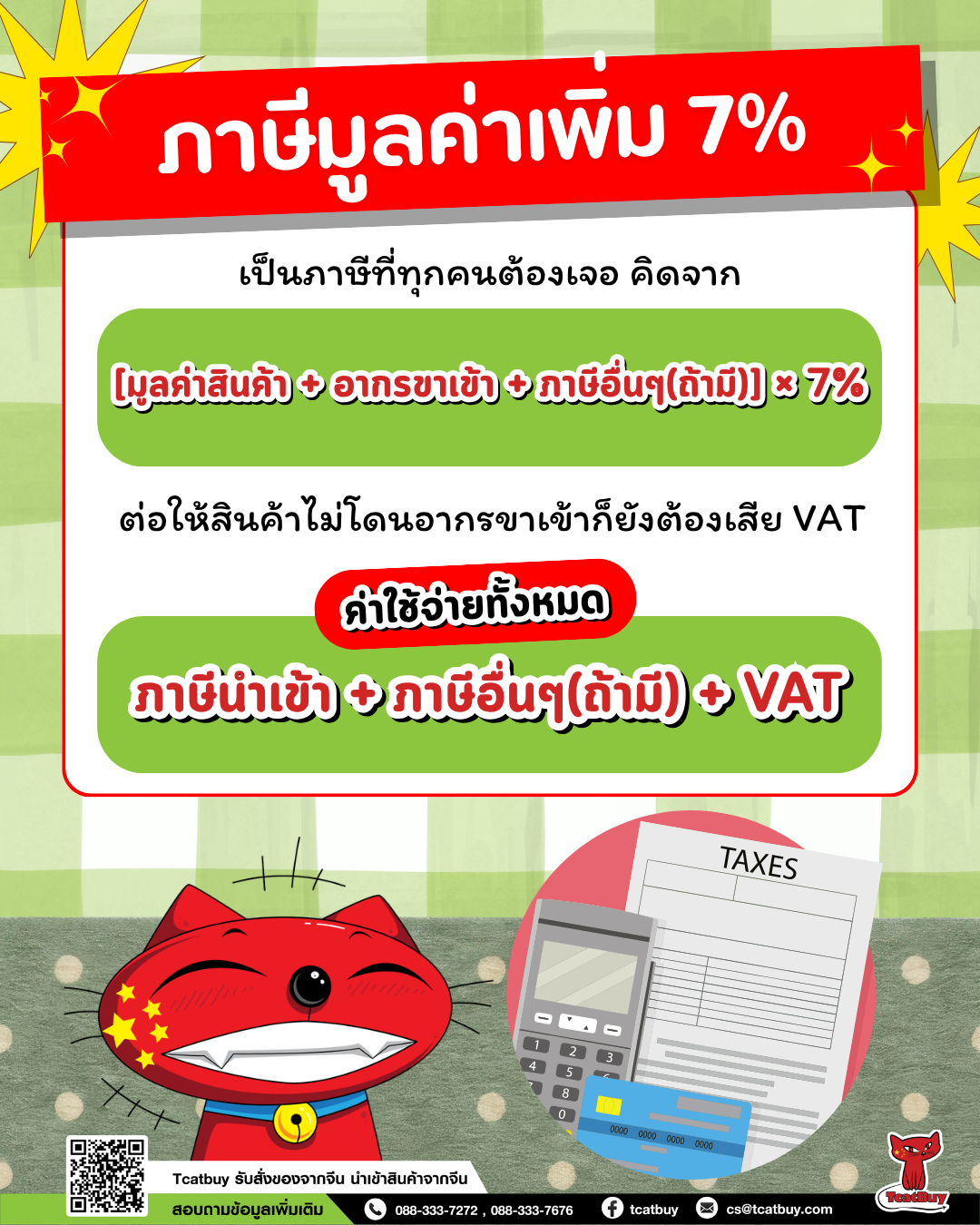 [มูลค่าสินค้า + อากรขาเข้า + ภาษีอื่นๆ(ถ้ามี)] × 7%
