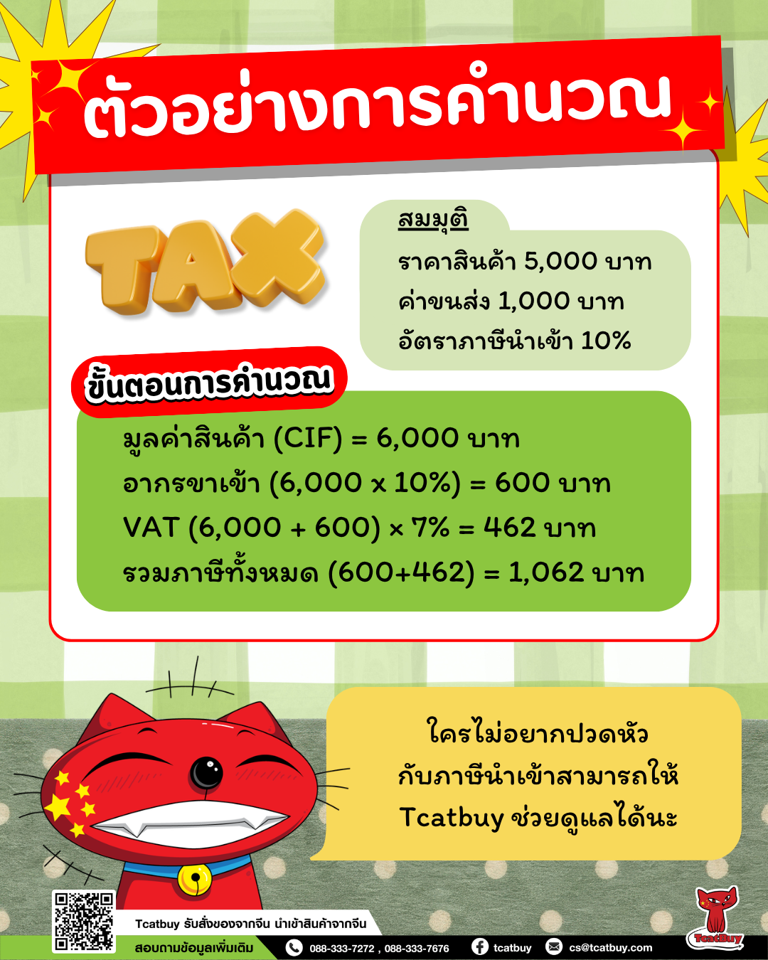 ค่าใช้จ่ายทั้งหมด = ภาษีนำเข้า + ภาษีอื่นๆ(ถ้ามี) + VAT